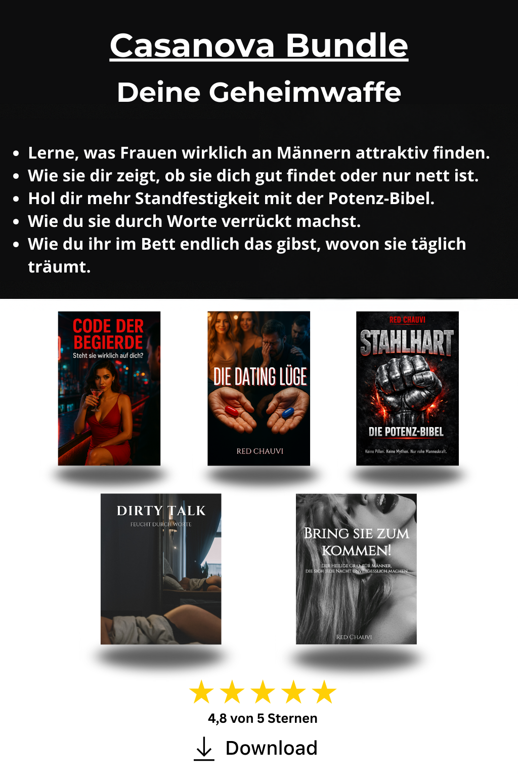 Die mächtigsten eBooks, die ein Mann besitzen kann. Bruder, vergiss Disney-Märchen und Netflix-Romanzen. Hier bekommst du die rohe Wahrheit – direkt, hart und unzensiert. 5 eBook Ratgeber. 5 Waffen. 1 Mission: Mach dich zum Mann, den Frauen respektieren und begehren.